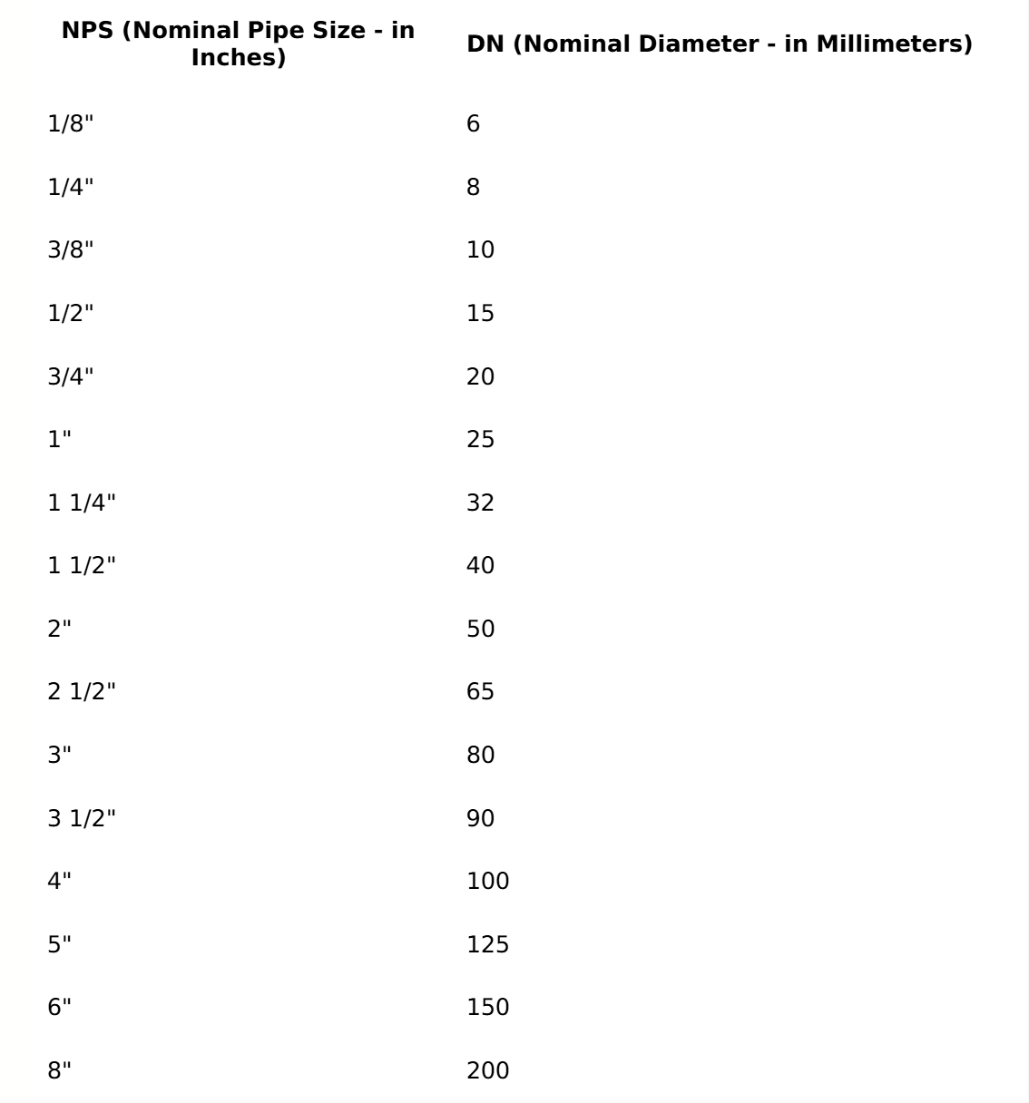 ومع ذلك، هناك استثناءات. على سبيل المثال، 3" × 25 = 75، وهو ما يتم تقريبه إلى DN80. هناك أيضًا أبعاد البوصة مع الكسور أو الكسور العشرية مثل 1/2"، 3/4"، 1-1/4"، 1-1/2"، 2-1/2"، 3-1/2"، لا يمكن حسابها بهذه الطريقة، لكن الحسابات هي نفسها تقريبًا، وهي في الغالب قيم قياسية :