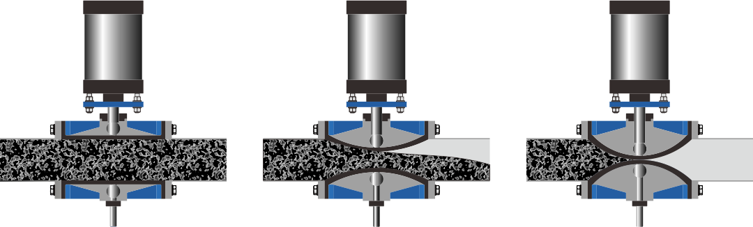 إغلاق: تقوم آلية القيادة (اليدوية أو الهوائية أو الكهربائية) بدفع قضيبي التثبيت، مما يؤدي إلى ضغط الغلاف المرن بدقة على طول الخط المركزي لتحقيق إغلاق محكم. حتى عندما تكون الجزيئات الصلبة موجودة في الوسط، فإنها تكون محاصرة ومحظورة بإحكام.